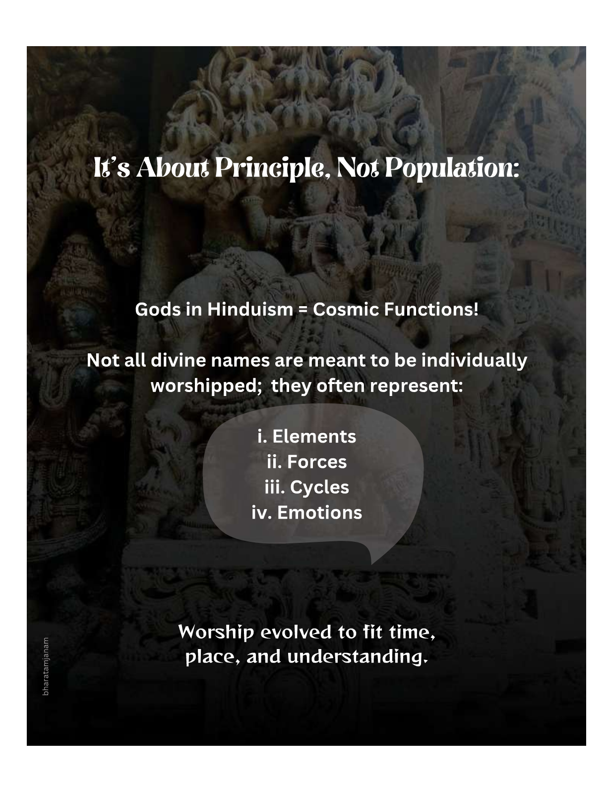It would be wrong to see a change in religion or a deviation from the Vedic idea of divinity in what is merely a matter of fashion, It is a way of representing the Divine that suited a particular time or country, a particular set of habits, or a different conception of the universe. The gods are universal principles; they are all-pervading realities. The words or forms we use to represent them are mere approximations.