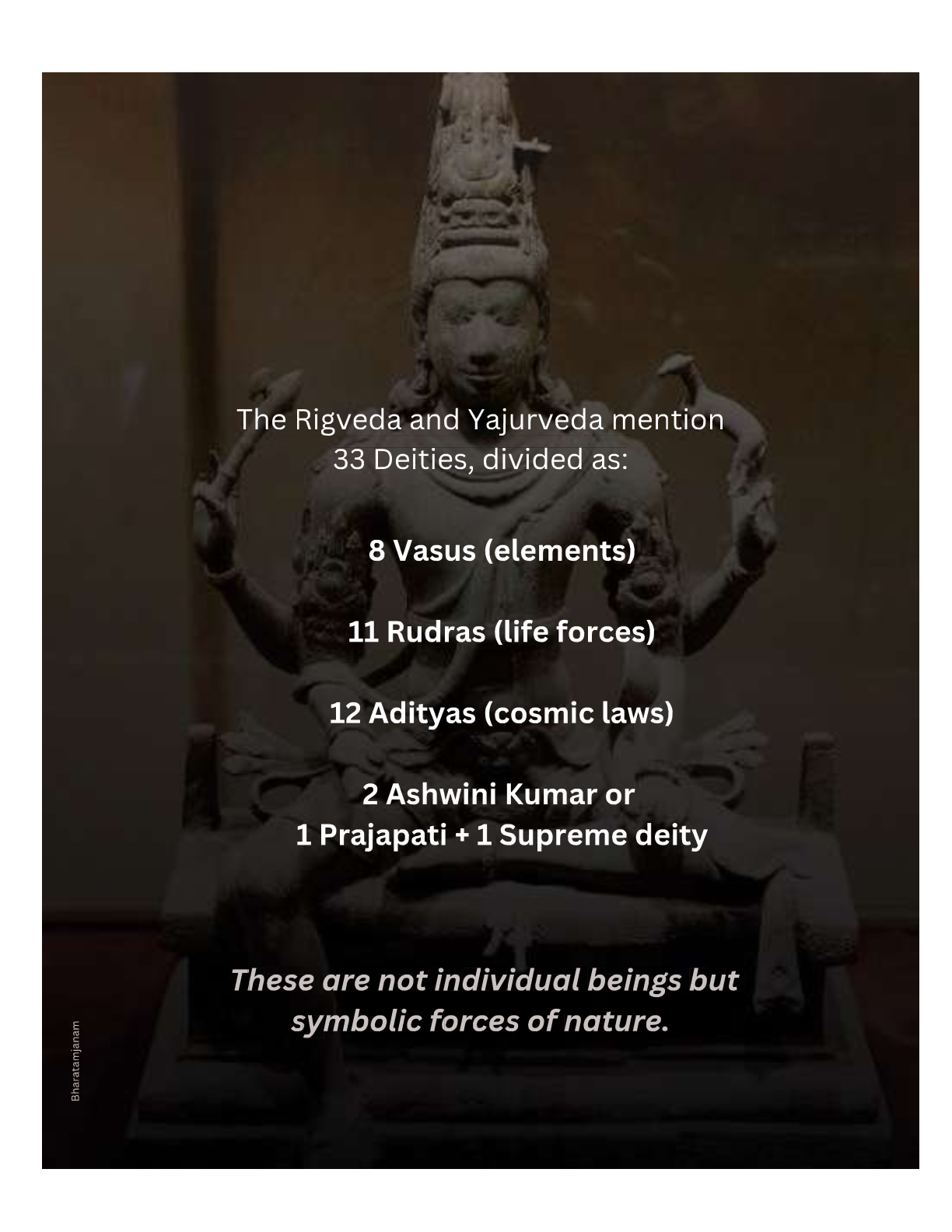 Naturally, these forces of nature were given divine authority and the chief protectors became main gods. Rigveda tells us about 33 of them.